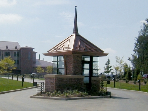 Falling Rock, a new hotel built on the golf course Mystic Rock, required an angled standing seam roof on the guard house at the entrance, and a custom fabricated copper application on a water fountain adjoining the hotels infinity pool.